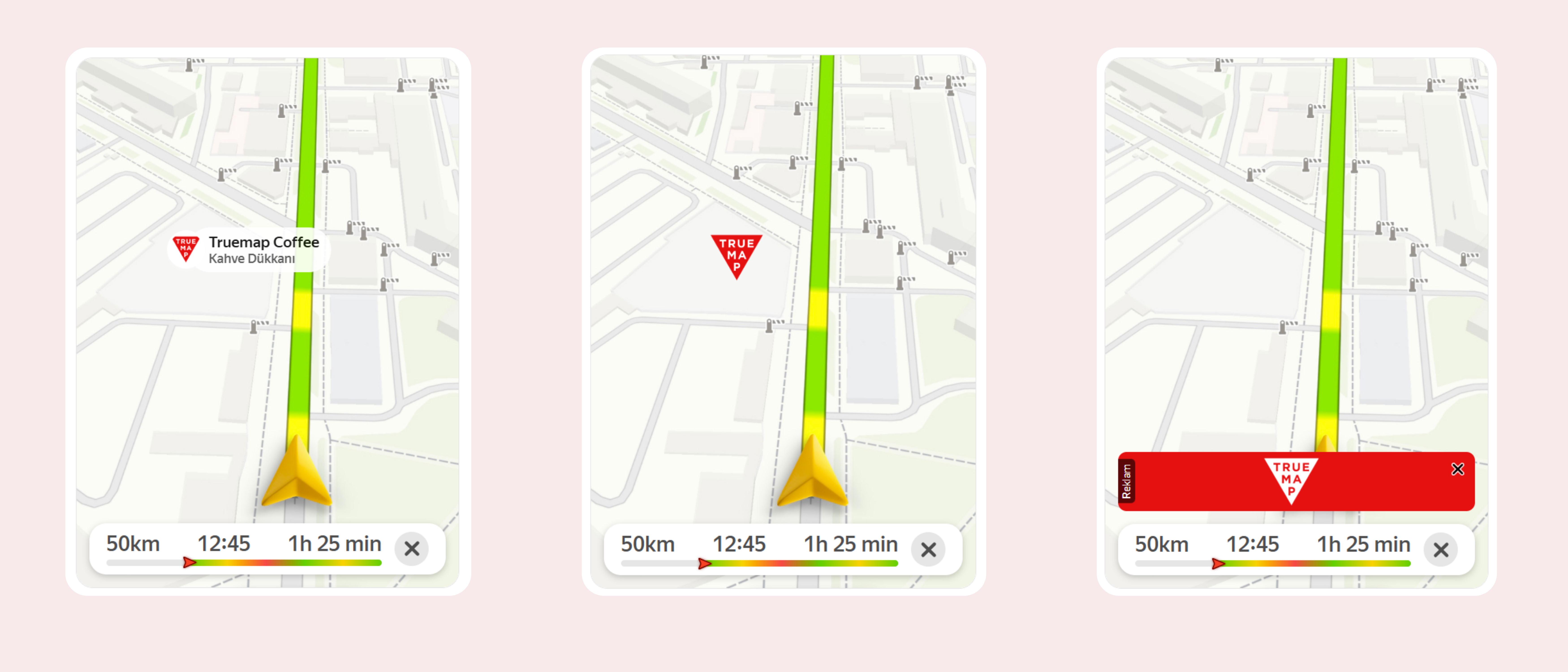 Türkiye’de navigasyon uygulamalarının %87 gibi yüksek bir kullanım oranına sahip olması, işletmenizi doğru müşterilere ulaştırmak için harita reklamlarını vazgeçilmez kılmaktadır. Truemap ile müşterilerinizin rotasında, karar anlarında ve ihtiyaç duydukları her noktada bulunarak, işinizi bir adım öteye taşıyabilirsiniz.